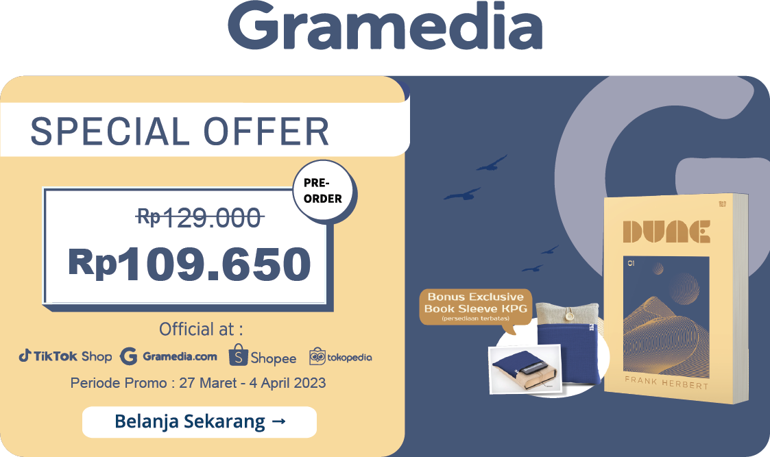 Dune karya Frank Herbert kini sudah terbit dengan versi Indonesia. Segera ikuti Pra-Pesan Dune Bagian 1 sekarang, dan dapatkan bonus spesial yaitu ekslusif booksleeve KPG!